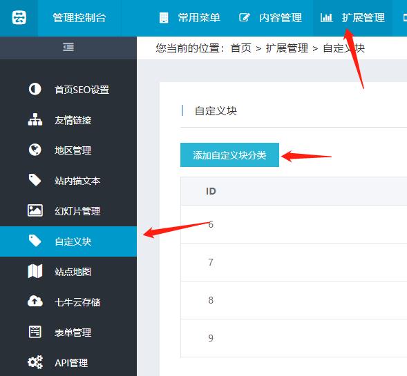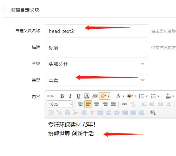 注意在編輯“自定義塊”的時(shí)候“自定義塊的名稱”一定不要去修改,修改之后前臺會(huì)調(diào)取不到該“自定義塊”的內(nèi)容。